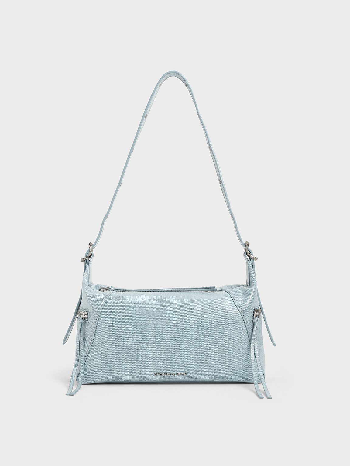 Let this Xylia shoulder bag in vinyl denim be the perfect complement to all your cool-girl outfits. Re-interpreting the classic 90s baguette bag, this piece exude a decidedly bold and edgy aesthetic that is made for the modern woman of today. For the girl who loves carrying more than her essentials, this bag offers a roomy main compartment as well as side zips for keeping your most-used items within easy reach.