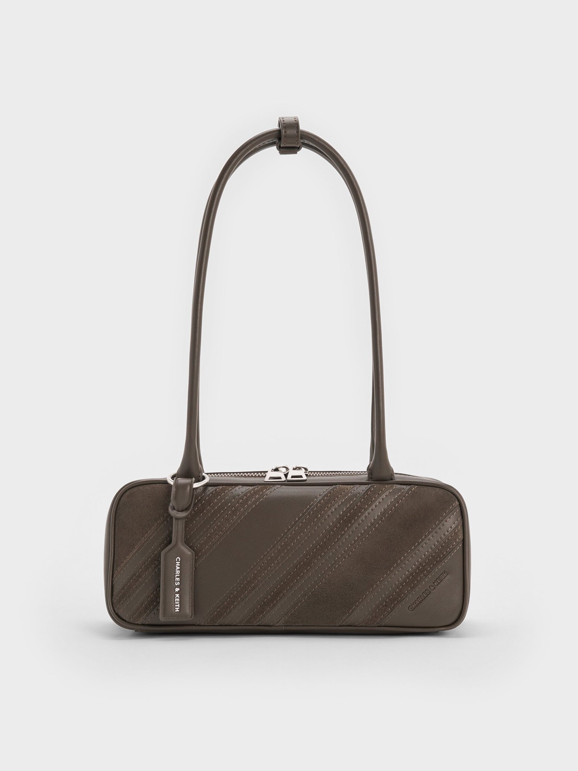 This Zeya shoulder bag in moss green is made with recycled suede and features striped panels, a rectangular body and double handles. Carry it to introduce subtle texture and rich colour to simple everyday outfits.Recycled suede requires a little extra care. After each use, gently brush the surface in one direction with a soft brush to remove dust and dirt. For stubborn stains, lightly dampen a cloth with a mild cleaning solution and gently rub the fabric until the stain is gone.