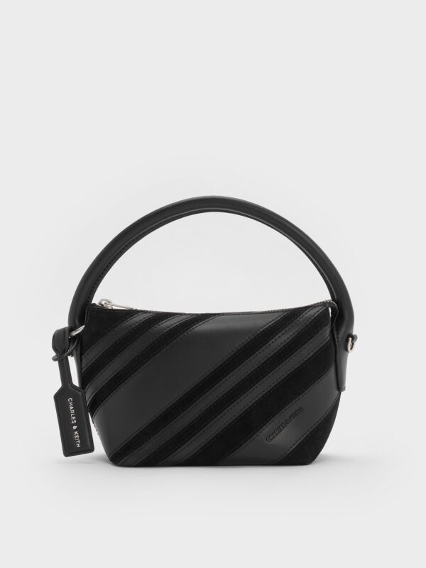 This Zeya top handle bag in black is made with recycled suede and features striped panels, a compact construction and a detachable shoulder strap. It will ground weekday outfits with its versatility and striking details.Recycled suede requires a little extra care. After each use, gently brush the surface in one direction with a soft brush to remove dust and dirt. For stubborn stains, lightly dampen a cloth with a mild cleaning solution and gently rub the fabric until the stain is gone.