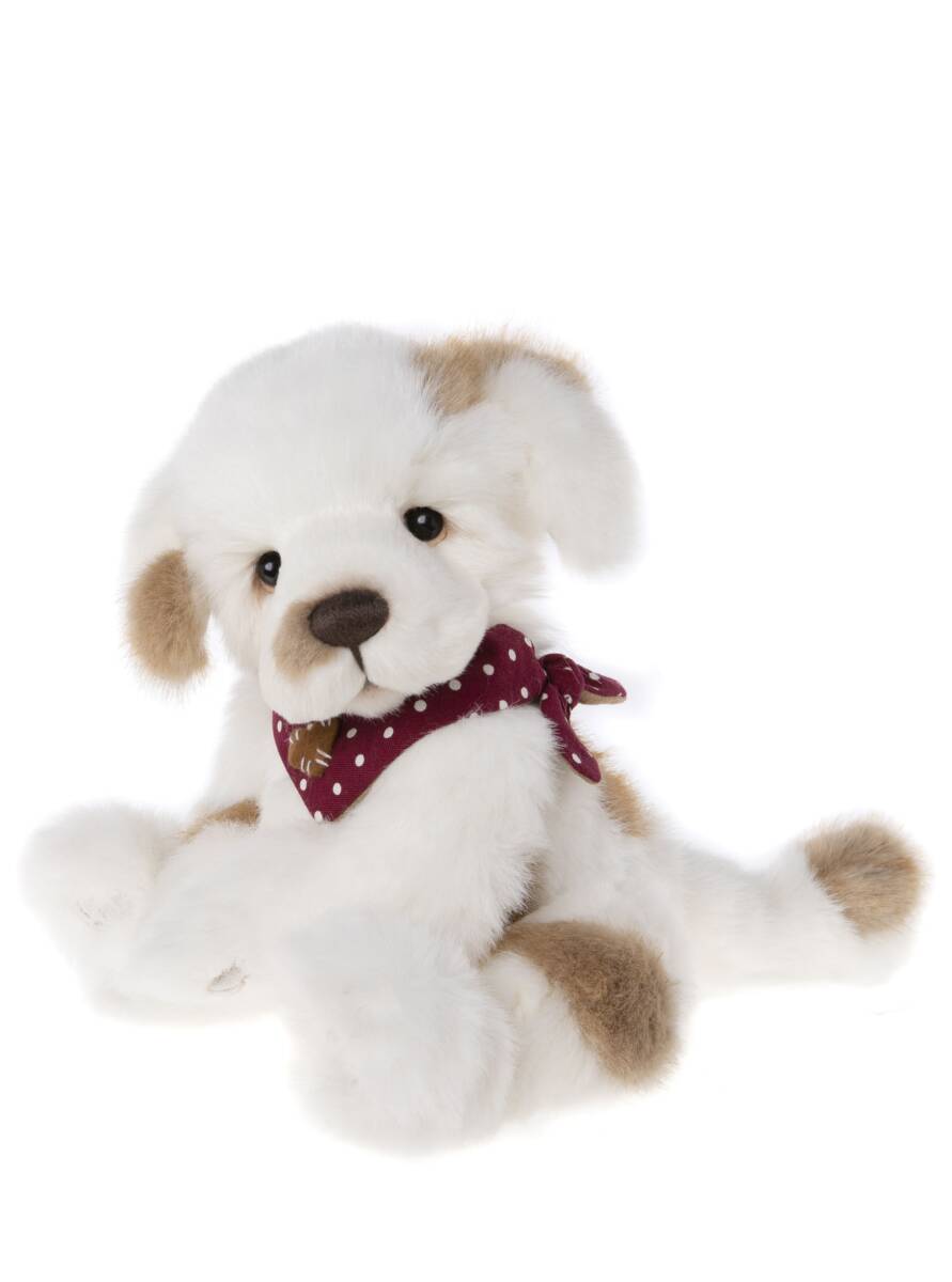 He has been made using a super soft white plush with caramel coloured accents. He has sweet floppy ears with the cutest chocolate brown embroidered nose and glistening eyes upon his adorable face. To finish he is wearing a burgundy spotted neckerchief. He has also been softly filled and weighted for that captivating, true-to-life, puppy feel.