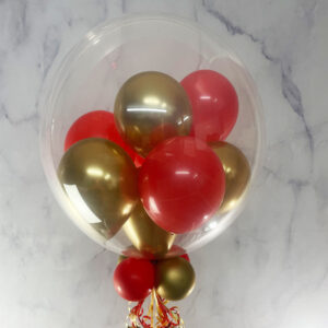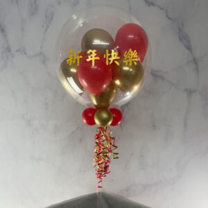 See in the Chinese New Year with our fantastic balloon package, which includes a bubble balloon, two sets of foil balloons and a set of scatter balloons. The bubble balloon is filled with 8 red and gold balloons, and finished below with 8 matching ribbons. We also include 8 scatter balloons – four red and four gold. The package includes two sets of foils – 2 red and 1 gold in each set. Each balloon will come with a small Chinese New Year card and envelope (see images). This can be used to add a special note (we will use these if you add a gift tag) or money (which you can do yourself upon delivery).