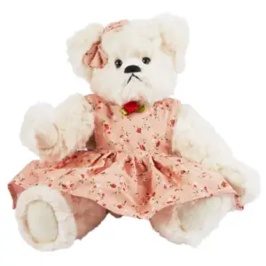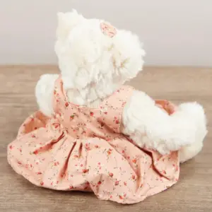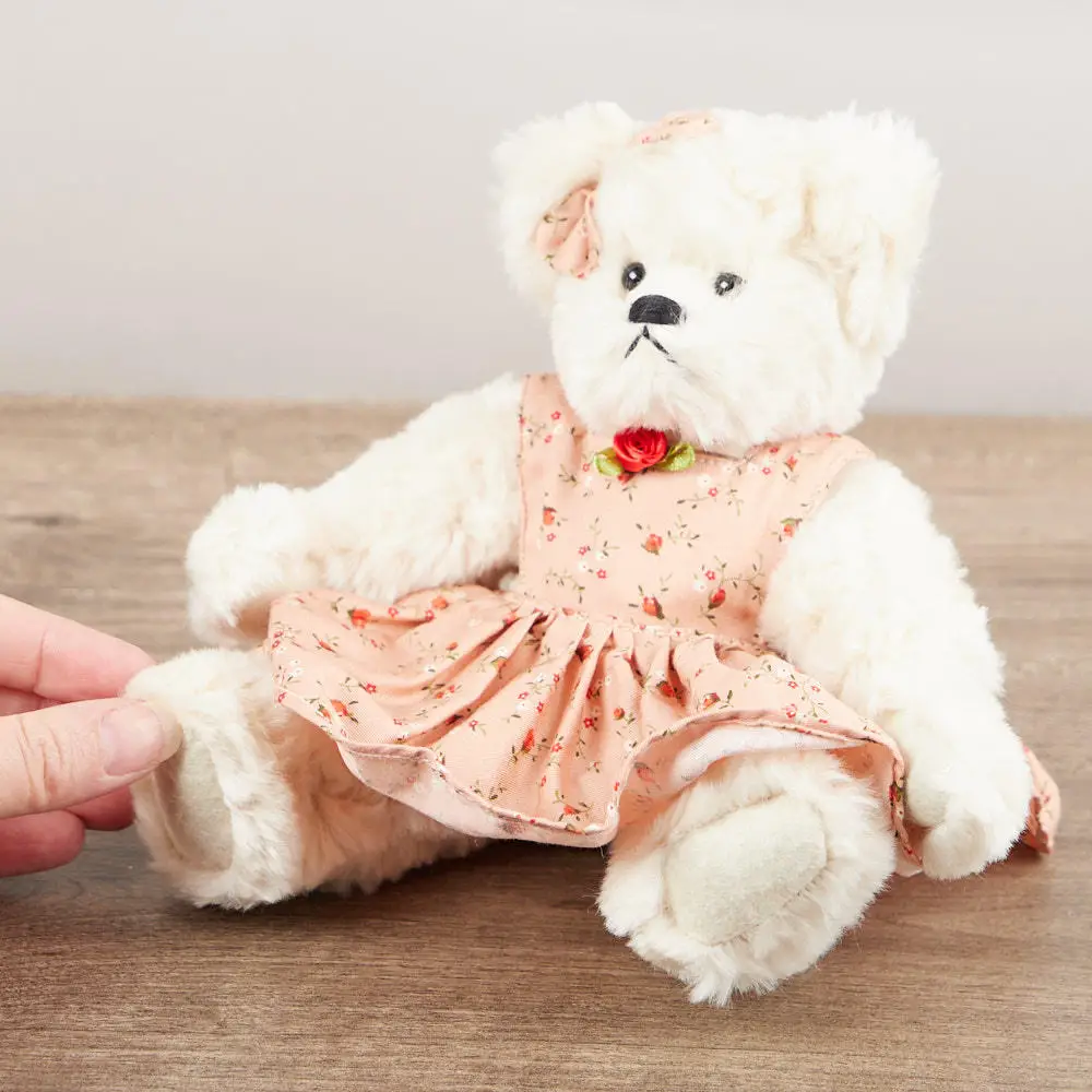 Design: Off-white teddy bear with pink floral dress and fabric rose, jointed limbs