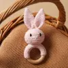 Crochet Rabbit Baby Rattle, ideal for newborns. This handmade bunny rattle with a wooden handle is perfect for stimulating baby’s senses. Order now!