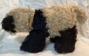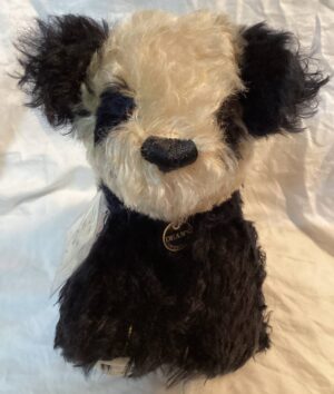 This is a replica of the 1949 Ming Panda made by Deans, he is not jointed and has weighted bean filled feet to keep him standing on all fours. He is made with an antique cream coloured wavy mohair and black for his panda markings, with glossy amber eyes.
