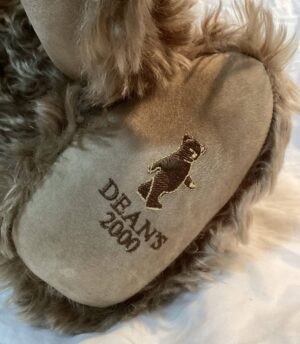 A bear created by Deans Bear Co to commemorate the year 2000. He is five way jointed and made with a dense wavy wheat brown coloured mohair with glossy plastic amber rimmed eyes. He has matching wheat coloured suede paw pads.