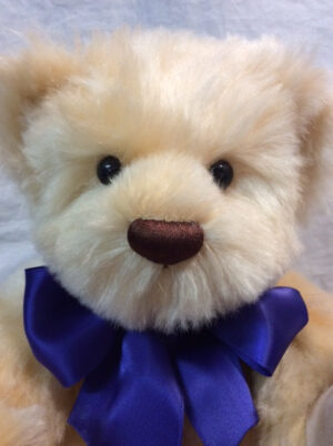 Platinum is a 35 cm / 13.7" fully jointed teddy bear. He has been sewn from a luxuriously dense, semi-fluffy cream mid-pile mohair and smooth light-grey paws, with his right paw featuring the iconic logo badge and his left has been embroidered in silver-grey with, 2009 Platinum Membership. His glossy black eyes and fabulous, hand stitched chocolate nose, brings the charm. To finish he wears a sumptuous, deep royal blue, satin ribbon bow and his round Deans Silver Members Club pendant, confirming his importance.