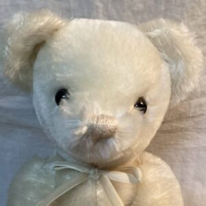 A cream five way jointed bear created with a cream coloured mohair with matching creamy velvet paw pads. Her thread stitched nose is in a nude/very pale pink and she has brown rimmed glossy eyes.