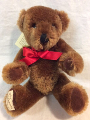 Mr Jones is a 21 cm / 8.2" fully jointed teddy bear. He has been sewn from a luxuriously dense, short-pile, chestnut mohair and smooth faux suede chocolate paws, with his right featuring the iconic logo badge. His engaging, glossy black eyes and black hand stitched nose brings great appeal, whilst his traditional red satin ribbon bow completes the charm.