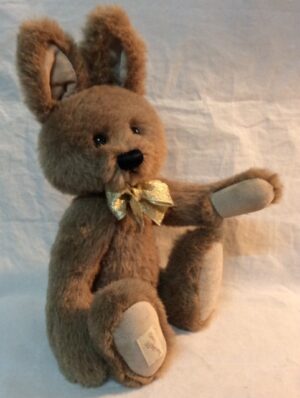 Runkel is a fully jointed character rabbit. He has been sewn from a sumptuously dense, nutmeg brown alpaca, with smooth nougat hued, faux suede inner ears, palms and soles (with his right featuring Deans' iconic logo badge), enchanting glossy black eyes, with a kiss-able hand stitched black nose and mouth, finished with a shimmering, metallic gold ribbon bow. Too adorable!