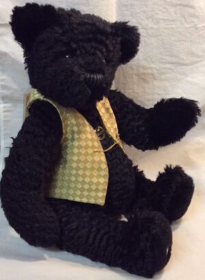 The Black Prince is a generous 54cm (22") fully jointed teddy bear, with beans in his lower half, for that satisfactory, squidgy soft hug and size-able tum. He has been sewn from a luxuriously dense and wavy, glossy black mid-pile mohair with a shorter, smoother mohair for those tactile paws, with his right sole featuring the iconic, Deans Rag Book Co. logo badge. He has large cupped ears with a glorious chubby, cubby look and feel, whilst his engaging, glossy black eyes and black hand stitched nose, highlighted with golden thread add to the appeal of his endearing face. To finish he wears a woven check patterned, gold satin waistcoat, fastened with a golden chain, plus a black and gold Dean's pendant worn around his neck, confirming his identity. A regal cuddler!