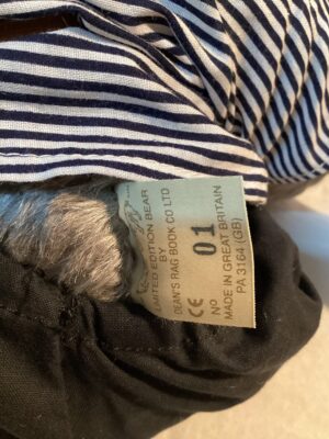 Gustav the Pirate is a five way jointed silver grey coloured mohair bear with darker grey suede paw pads. He is wearing a cotton red neckerchief and a navy and white striped top, belted with a brown leather belt. He has cut off black trousers and a felted black eyepatch. He is the limited edition of 1/75 pieces and will come complete with his sewn in tag of authenticity as shown in the picture.