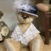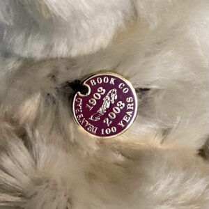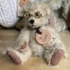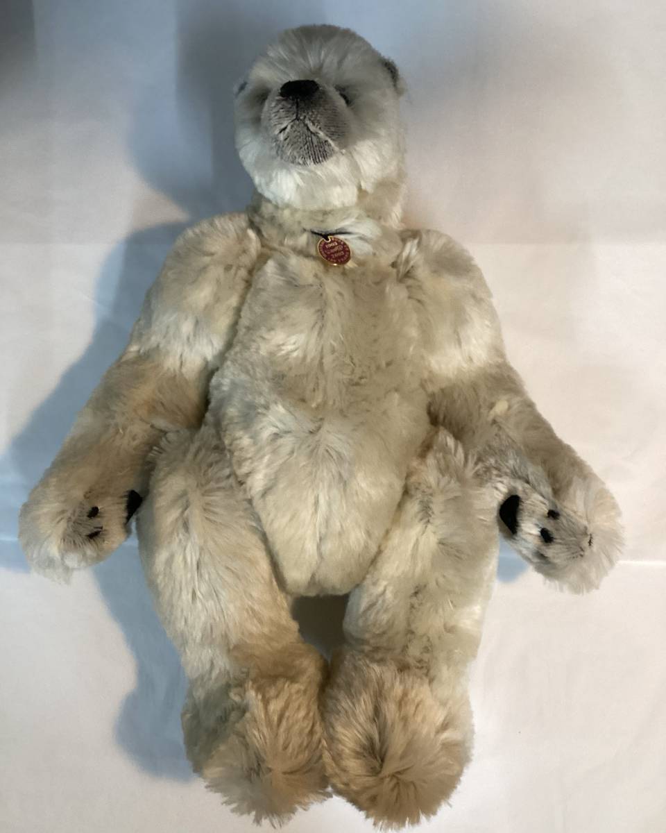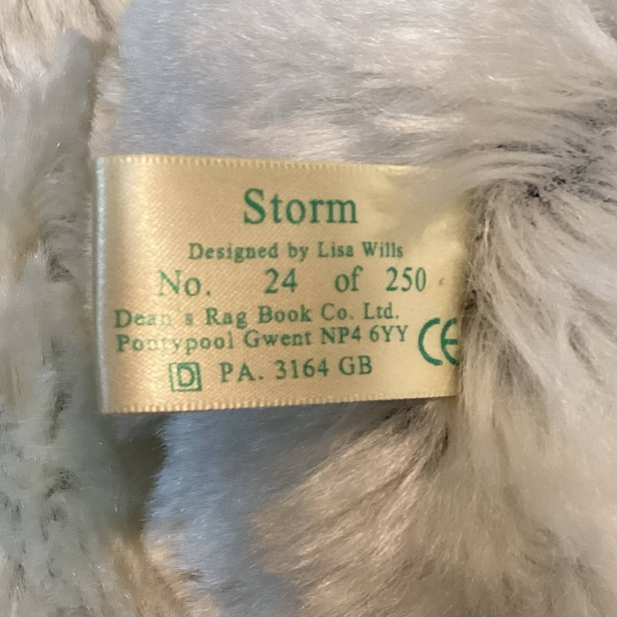 Storm is a Centenary Year 2003 Artist Showcase Limited Edition polar bear from Dean’s Rag Book Co., designed by Lisa Willis. Storm is five way jointed. The bear is made of a white mohair, which is shortened on the muzzle, with a dark grey fabric underneath. He has black eyes and a sewn black nose and mouth. The bear stands at just over 50cm tall, and has embroidered black paw details, with a fabric Dean’s Rag Book Co. tag sewn onto the left foot paw.