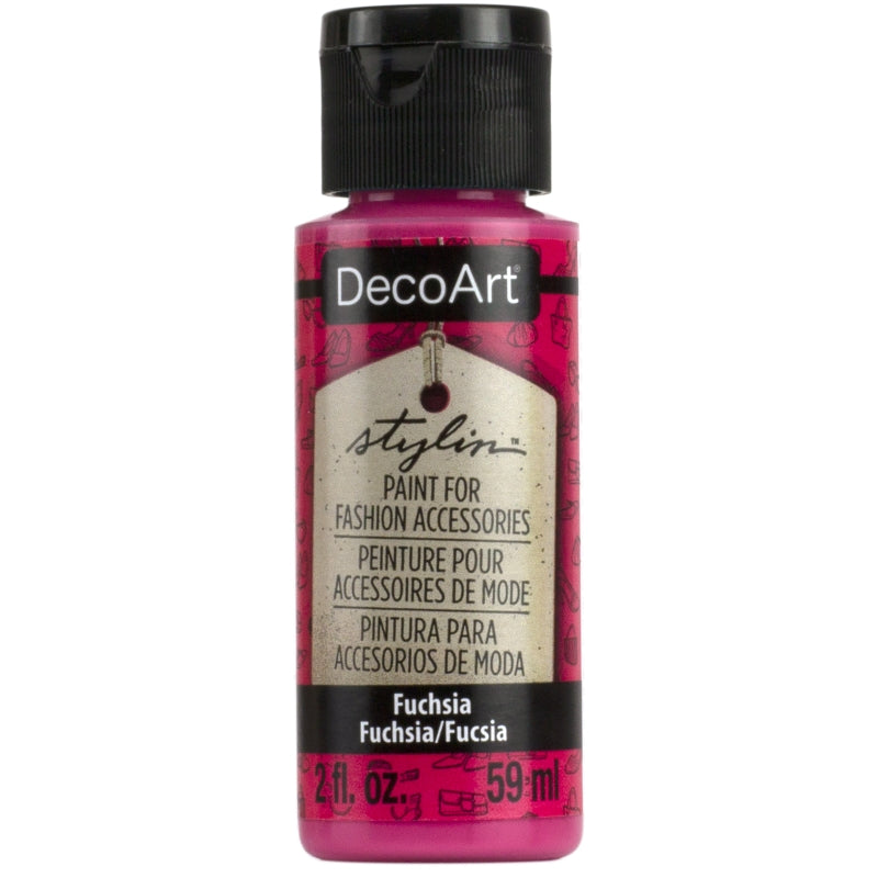 DecoArt Fuchsia Stylin from World of Craft. DASAL04-30. Fuchsia Stylin. Stylin. Create custom fashion looks or refresh real and synthetic leathers, canvas, burlap, and more with this flexible, multi-surface fashion acrylic paint. Stylin is specifically formulated to penetrate surfaces and provide a seamless, durable finish. Make a personalised fashion statement that is all you! Ideal for stenciling, decorative painting, and watercolour techniques. Flexible paint specially-formulated to prevent cracking or peeling. Bonds to surface to create a seamless finish. Ideal colour palette for fashion decor. Water-based. Soap and water clean-up. MPN DASAL04-30