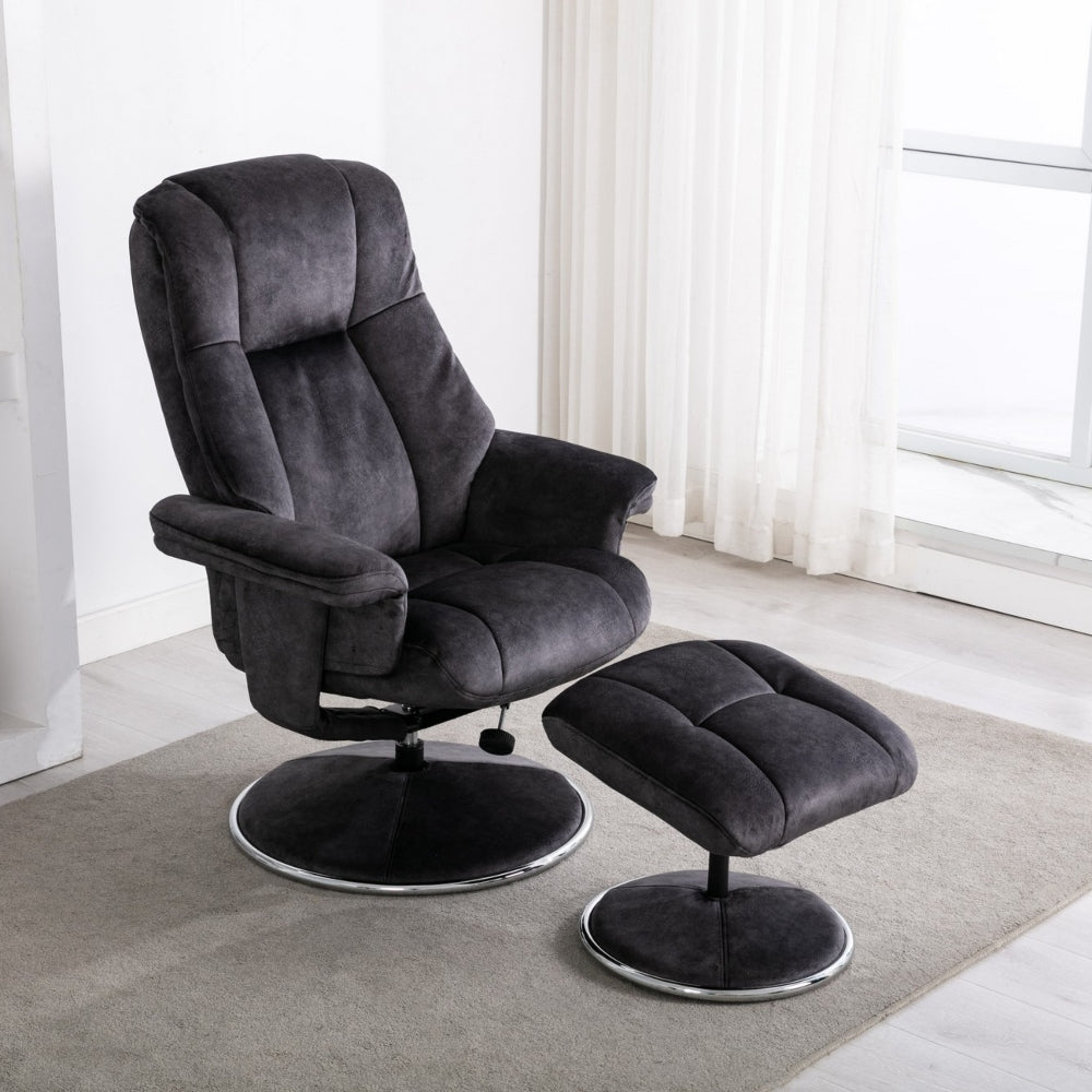 A classy Soft Fabric recliner upholstered in gorgeous Fabrics. The Denver is a sleek, luxurious swivel recliner in gorgeous soft and strong fabric. The Elephant is a beautifully soft faux suede, and one of my favourite materials for any chair. Why not treat yourself to the brand new Chacha fabric range? A new material for us, but one I’m certain you’ll love to snuggle into on a cold winters night. Colour Availability as of 11/03 Elephant Low stock Liqourice Early April Chacha Dove In stock Chacha Fern In stock Chacha Oat In stock Chacha Ocean In stock And I will not be beaten on price! Call me up to 2100 at night, 6 days a week, and I will match anybody’s price! High-grade Soft and Strong Fabric. Rich colour palette. Sleek finish. Luxurious recliner at a sensible price A substantial chair with wide seat and high back Excellent support for the head and lumbar Made with high grade fabric Matching round base with coloured insert Comes with matching footstool Plenty of width. High back. Full-body support. This substantial chair offers plenty of seating width, as well as a high back that will cater for taller customers. It also provides full support for the head and lumbar, whilst the accompanying footstool ensures your feet and legs are not neglected! Lean back and the chair smoothly reclines; to fix it in position simply apply the easily accessible lever. 360-degree swiveling. True rotational freedom. Take it for a spin. This chair swivels a full 360 degrees, giving you complete flexibility. Features Soft and strong, easy clean fabric Round matching base Steel frame Manual recline Supports up to 18 stone Medium assembly required