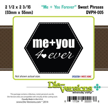 Die-Versions Sweet Phrases – Me You from World of Craft. Die-Versions – Sweet Phrases – Me You 2 1/2” x 2 3/16” (63 x 55mm) Die-Versions are thin, chemically-etched metal dies, used to cut out letters and shapes from a variety of materials. They are designed to cut cardstock, vinyl, vellum, foam, thin chipboard, cork, metallic paper, felt and more. Each die comes with a piece of ejection foam.