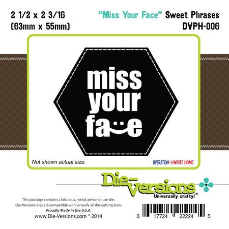 Die-Versions Sweet Phrases Miss Your Face from World of Craft. Die-Versions – Sweet Phrases – Miss Your Face 2 1/2” x 2 3/16” (63 x 55mm) Die-Versions are thin, chemically-etched metal dies, used to cut out letters and shapes from a variety of materials. They are designed to cut cardstock, vinyl, vellum, foam, thin chipboard, cork, metallic paper, felt and more. Each die comes with a piece of ejection foam.