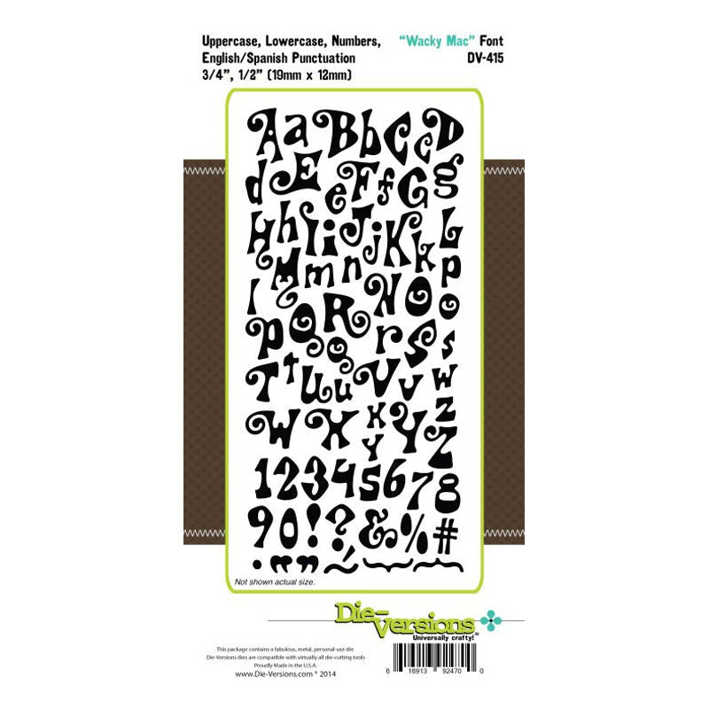 Die-Versions Wacky Mac Font from World of Craft. Wacky Mac Font. Uppercase, Lowercase, Numbers, English/Spanish Punctuation. 3/4”, 1/2” (19mm x 12mm). Die-Versions are thin, chemically-etched metal dies, used to cut out letters and shapes from a variety of materials. They are designed to cut cardstock, vinyl, vellum, foam, thin chipboard, cork, metallic paper, felt and more. Each die comes with a piece of ejection foam. DV-414. MPN DV-414