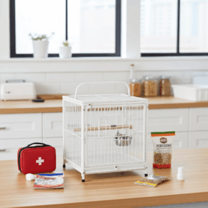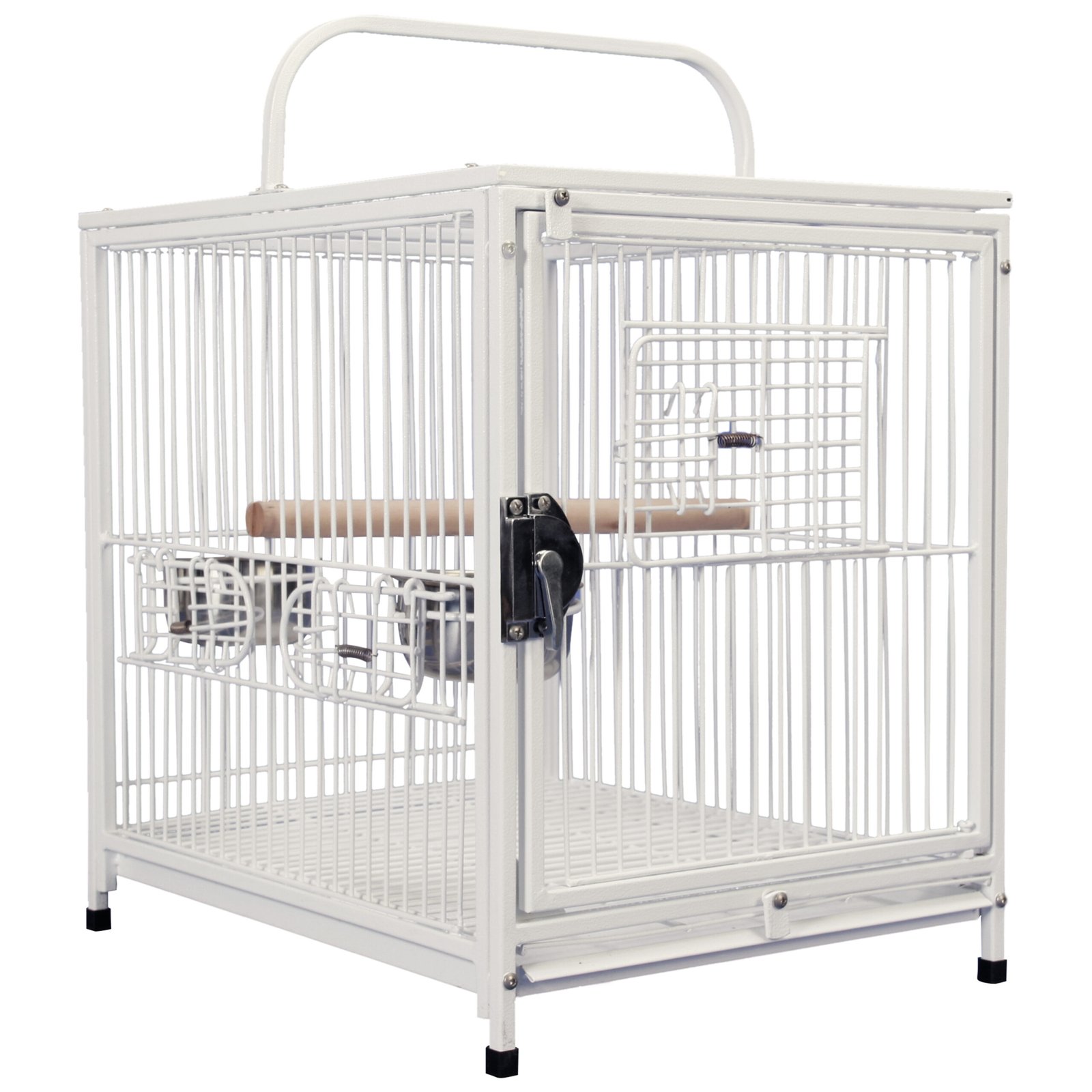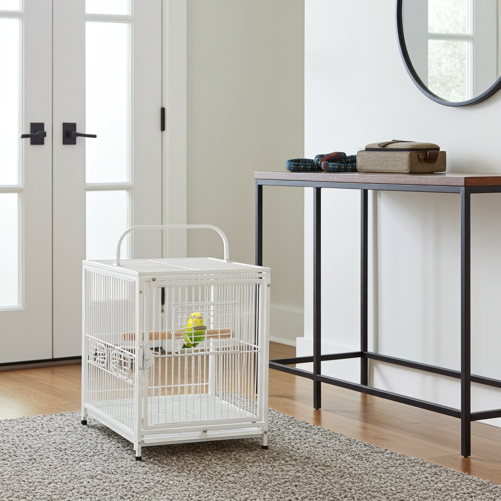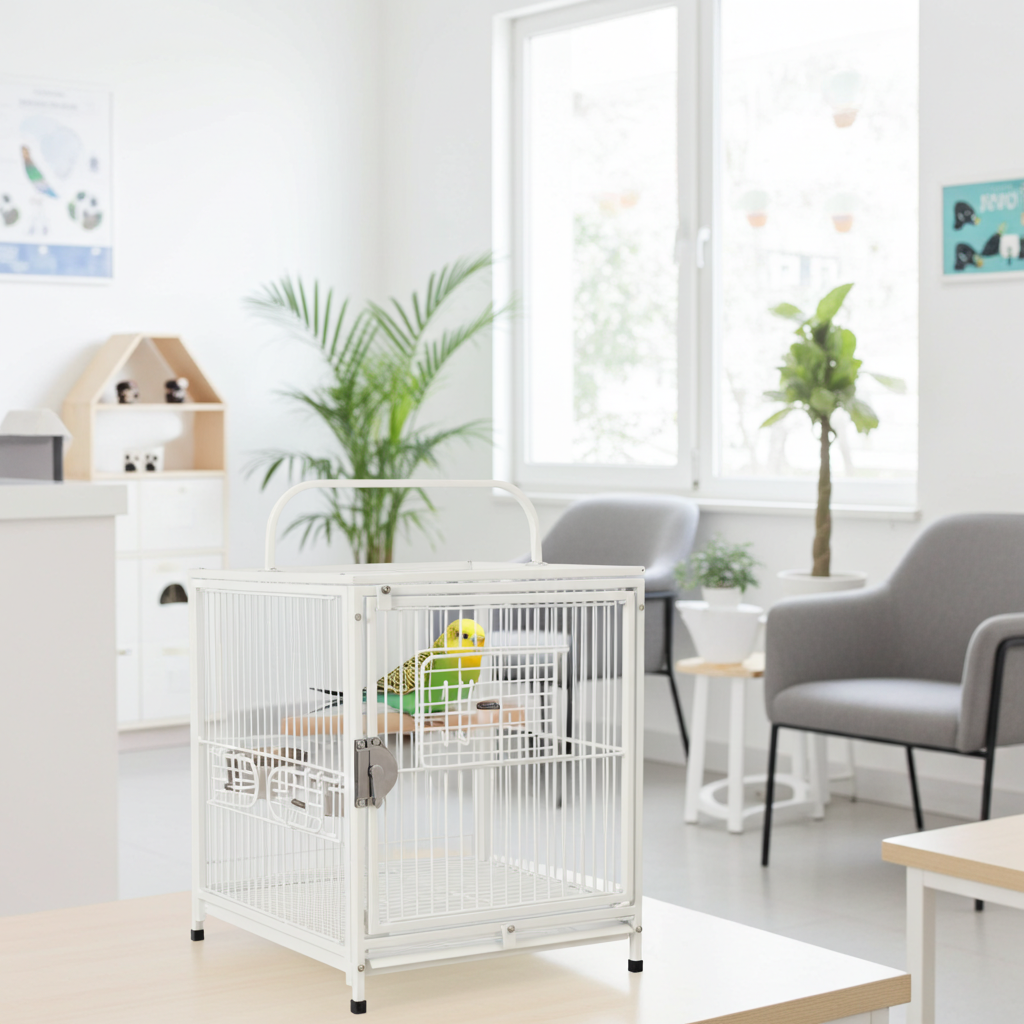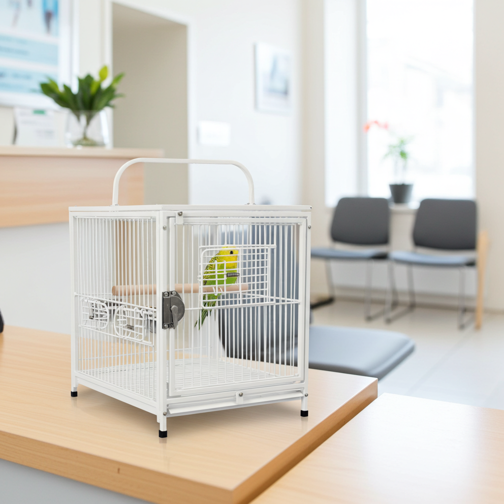 Finished in pristine white with fine-gauge wire construction, the Diplomat balances security with excellent visibility to reduce travel anxiety. One natural wooden perch and two 4" stainless steel cups are included, providing familiar resting and feeding options for your bird. The ergonomic top-mounted carrying handle allows comfortable, balanced transport, while the solid base with protective rubber feet ensures stability on any surface. A secure door mechanism with a reliable latch prevents escapes, making this lightweight yet robust carrier an indispensable accessory for responsible bird ownership.