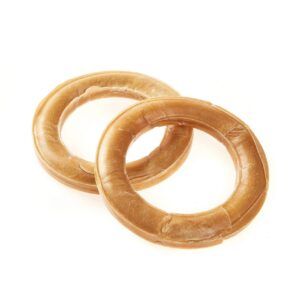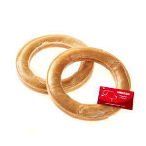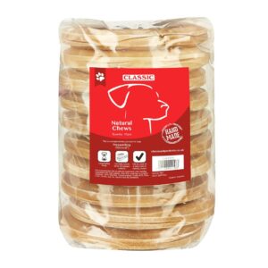 Dog Chew Pressed Rings 150mm – Pack of 10 | Classic are long-lasting, natural rawhide chews, perfect for medium to large dogs. These 6-inch (150mm) pressed rings provide a satisfying and durable chew, helping to support dental health by reducing plaque and tartar buildup while keeping your dog entertained.
