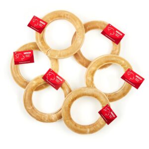 Made from 100% natural rawhide, these pressed rings are designed for extended chewing sessions, helping to promote strong teeth and gums while also relieving boredom and encouraging healthy chewing habits.