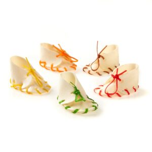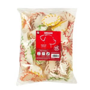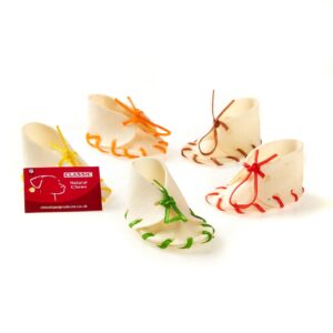 Dog Chew White Laced Shoes 65mm – Pack of 50 | Classic are fun, long-lasting rawhide treats, designed to satisfy chewing instincts while supporting dental health. These 2-inch (65mm) white rawhide shoes feature coloured laces, making them an engaging and enjoyable chew for small to medium-sized dogs.