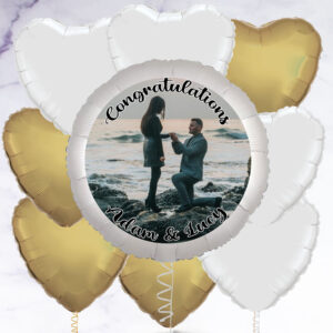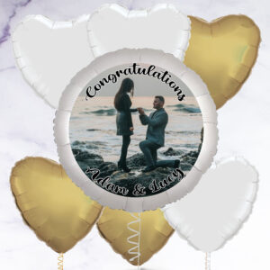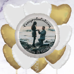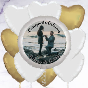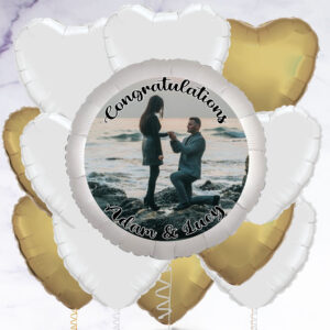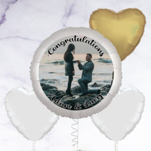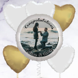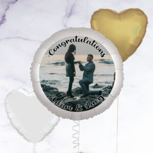 Our personalised photo balloon is a great gift to congratulate someone on their engagement, or even to propose with! You have the option to add a selection of white and gold heart-shaped foil balloons to make a beautiful bunch. Arriving inflated, you can add a photo of your choice to the balloon, as well as a personalised message. Photo balloon is 23″ in diameter, Foil balloons are 18″ – 20″ in diameter, Balloons arrived inflated with a weight, Float time: Approx 10 – 14 days, Note: If you order 4 or more balloons, your order may arrive in multiple boxes, How It Works Upload your image. Choose an image that’s as big as possible – this will allow you to choose the right part of your image to feature on the balloon., Use your mouse (computer) or finger (mobile/tablet) to move the balloon over your image in the preview above. Use the arrows to zoom in and out until you’re happy with your selection., Add your text – we can add one line of text at the top and one line of text at the bottom, or you can choose to have no text at all., Use the ‘Click here to see a preview’ button to see what your finished balloon will look like., On the next stage you can choose to add between 1 – 11 foil balloons to create a bunch.,