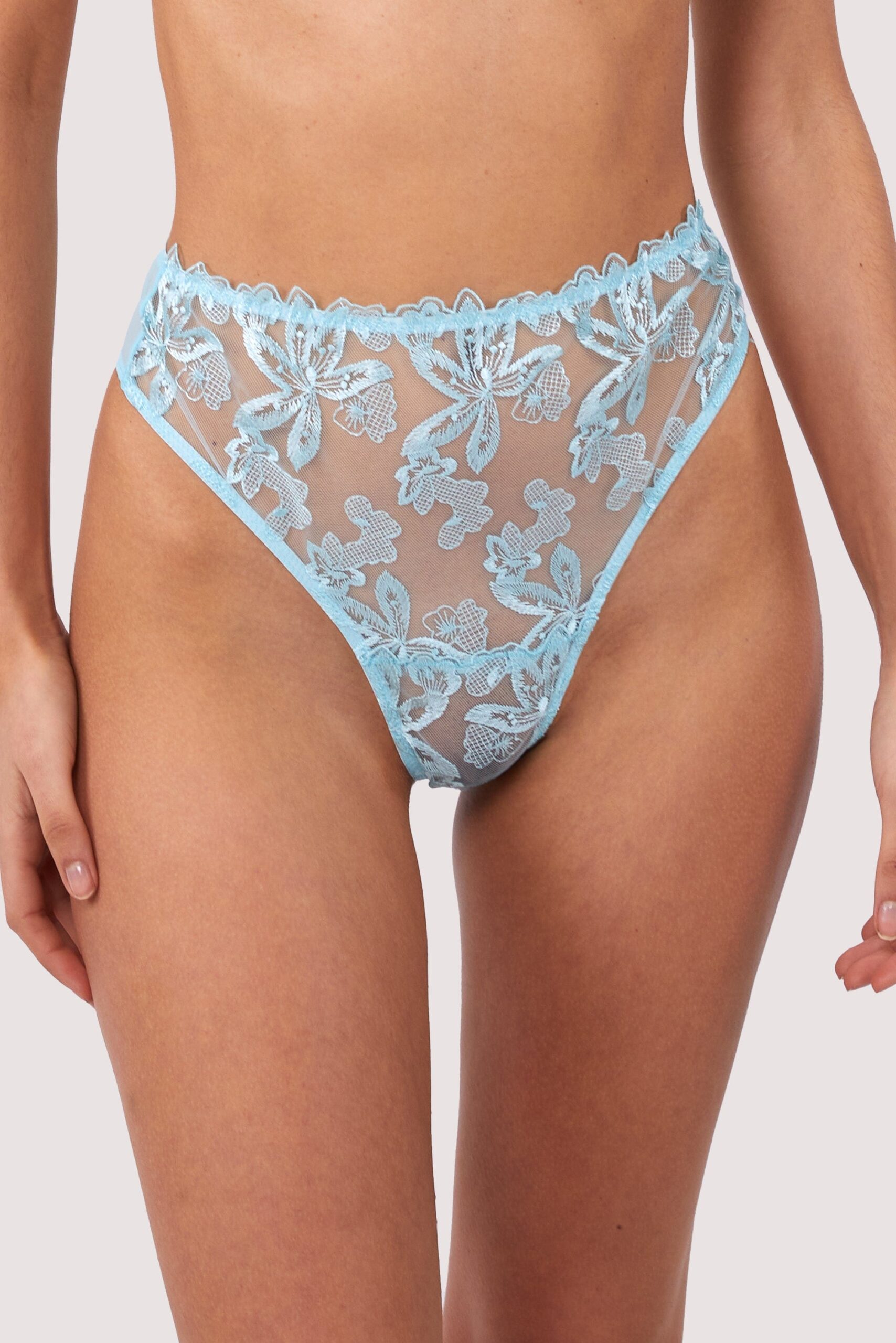 Feel elegant in Eva…The Eva Blue Graphic Embroidery High Waist Thong features a delicate floral embroidery centre over sheer mesh with a cheeky thong back. Match with the Eva Bra and Suspender Belt for the full elegant ensemble.