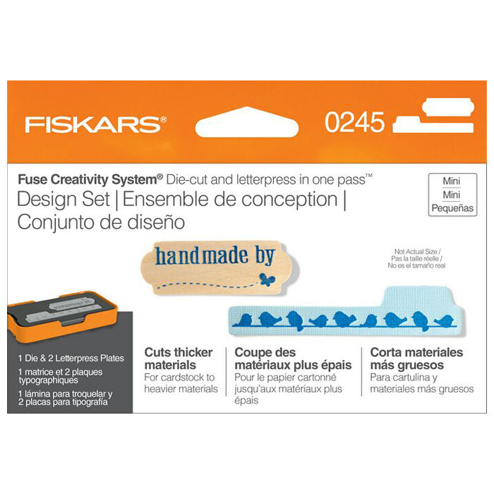 Fiskars Thick Material – Tags from World of Craft. Fuse – Mini Design Set – Thick Material – Tags. Thick Material Mini Design Sets include two dies and two letterpress plates (one for each shape). They cut thick materials like chipboard, wood veneer, cork, magnet, vellum, window sheets, vinyl, felt, fabric, foil, foam, cardstock and more. Some of the Design Sets offer 2 shapes that can be combined for more creative possibilities. Coordinating ID numbers on the Design Sets and Expansion Packs make them easy to match. All mini embellishments measure approximately 5 to 6,5 cm / 2” to 2,5”.