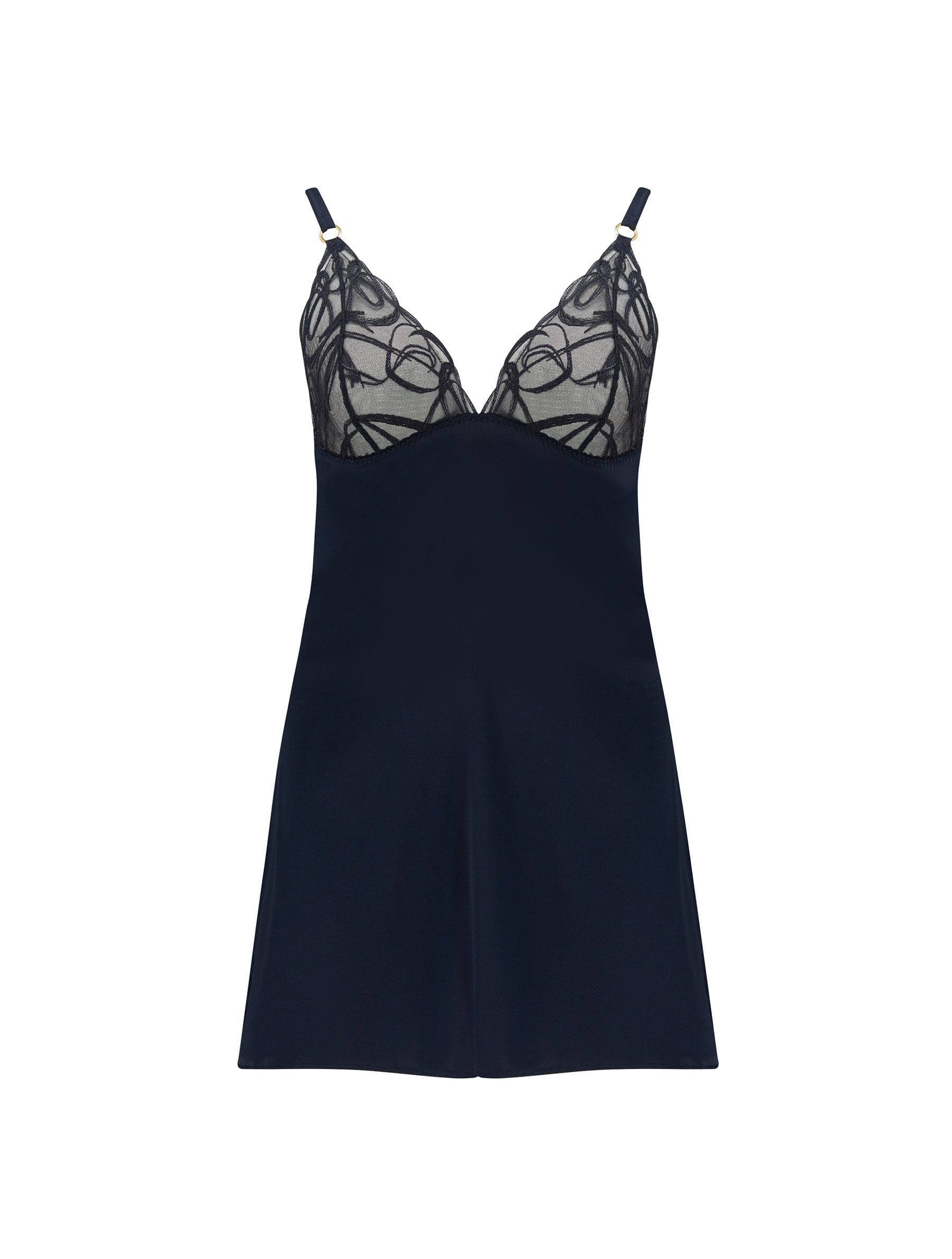 Fleur’s bold brush stroke design has been beautifully embroidered into the sheer cups of the silk babydoll which are held in place by gold-plated rings, that glisten in the light, and soft silk straps. Panels of embroidery also frame the sexy opening at the back of the babydoll.