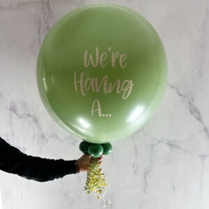 Our sage green gender reveal giant balloon is a 2ft wide, air filled balloon that marks the ultimate way to reveal the gender of your new arrival. This balloon is filled with blue confetti. The balloon is held up by the ribbons and collar as this is air filled, then someone can pop the balloon – and the confetti is thrown everywhere! 2ft wide, biodegradable latex balloon, Filled with blue biodegradable tissue squares, Can be personalised with your wording, Safe to transport and long lasting, so can be purchased several days in advance,
