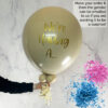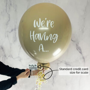 Our gender reveal giant balloon is a 2ft wide, air filled balloon that marks the ultimate way to reveal the gender of your new arrival. This balloon is filled with pink confetti. The balloon is held up by the ribbons and collar as this is air filled, then someone can pop the balloon – and the confetti is thrown everywhere! 2ft wide, biodegradable latex balloon, Filled with pink biodegradable tissue squares, Can be personalised with your wording, Safe to transport and long lasting, so can be purchased several days in advance,
