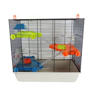 Measuring 50cm x 45cm x 33cm, this multi-level cage includes 3 shelves, 3 ladders, a hamster house, a wheel, 2 plastic tubes, and a feeding bowl, creating a fun and stimulating environment. The deep 10.5cm base helps contain bedding, while the two front doors and top-opening door (12.5cm x 10.5cm) allow for easy access for feeding, cleaning, and interaction.
