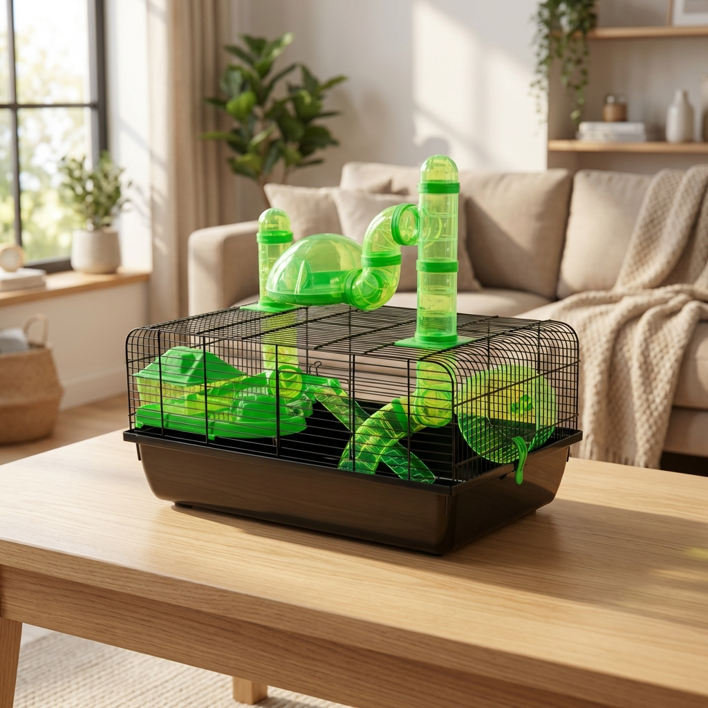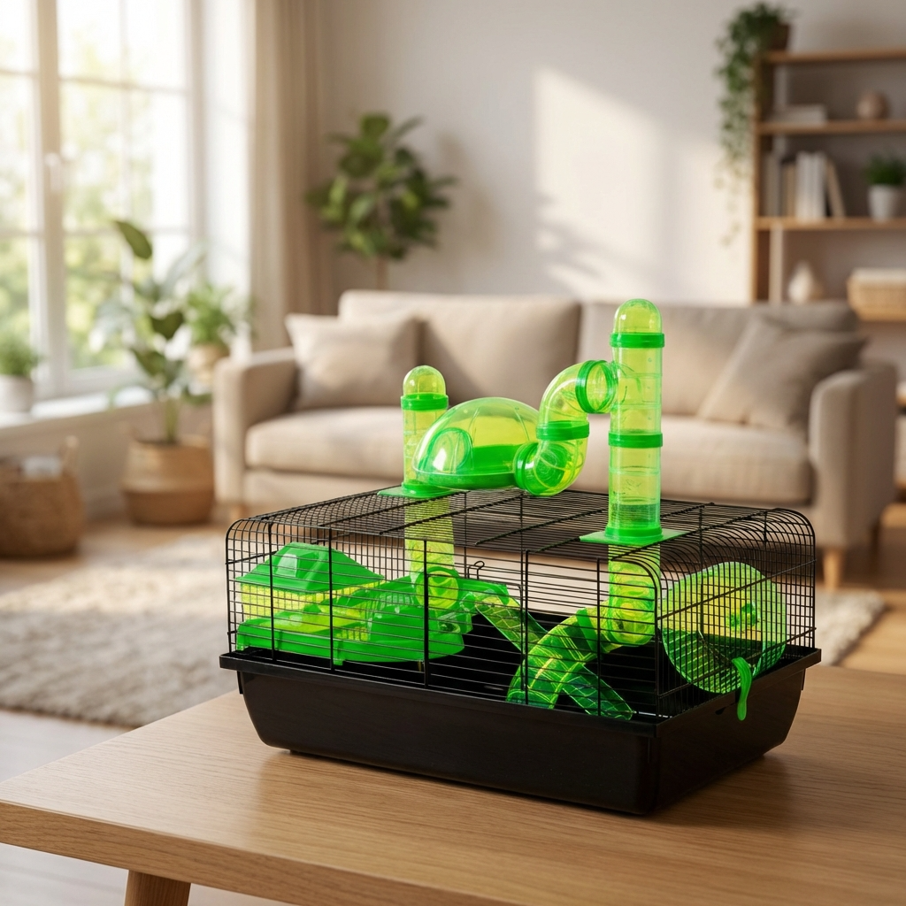 With a vibrant green base, this spacious and well-ventilated enclosure ensures comfort, security, and plenty of activity space, making it an ideal home for your furry friend.