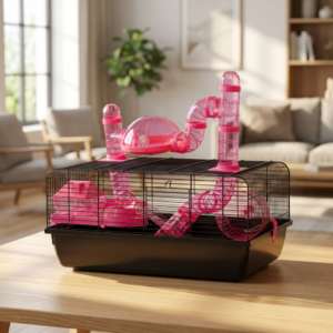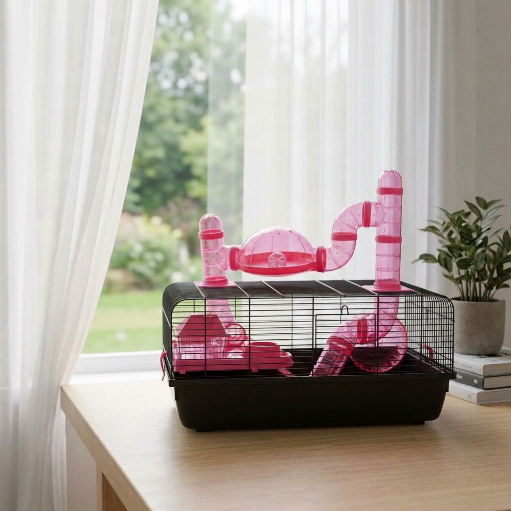 With a stylish pink accessories, this durable and well-ventilated enclosure is the perfect choice for pet owners looking for a secure, fun, and interactive habitat.