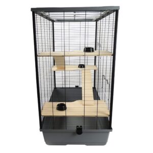 Measuring 80cm x 50cm x 43.5cm, the Mamble 80 includes a large substrate-holding shelf, tubing for play, a water bottle, a food bowl, and a corner litter tray, creating an enriching habitat for your pet. The two large hinged front doors (18cm x 23cm each) allow easy cleaning and interaction, while the fold-down doors ensure stability.