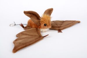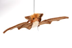 This mystical hanging, Brown Bat, has a 37cm wide wingspan, 16x37x10cm, and is a soft cuddly toy by the creators of realism – Hansa. He is made from a wonderfully tactile plush, with a velvet touch and large alert ears. Clear acrylic thread is attached to each wing, and then to a metal ring, enabling the bat when hung up, to look as though he is in mid flight. Fine airbrush details, producing shading have all been applied by hand. Surface wipeable.