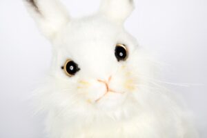 The White Rabbit is a L23 cm x W18 cm x H30 cm (9"x7"x11.8"), plush soft toy. He has been sewn from a luxurious plush, to resemble the coat of his living counterpart. This white rabbit has a genuine realistic form and has been crafted from a dense and semi-fluffy, white mid-pile, with short-pile accents, plus an even fluffier pompom tail and velvety-smooth inner ears. He has glossy, two-tone, golden safety eyes, with hand stitched features and acrylic whiskers. Carefully applied hand shading and painting has been used to define and shape, his appealing face, whilst giving him his seasonal black ear tips too. All this and he is still wonderfully soft and cuddly, with a delightfully tactile touch.