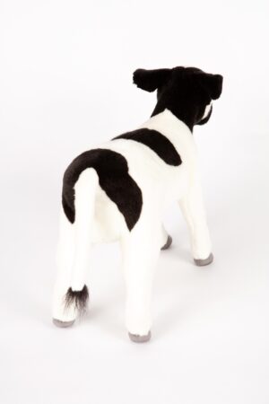 The Calf is a L35 cm x W14 cm x H33 cm (13.7"x5.5"x12.9"), plush soft toy. He has been sewn from a mix of luxurious plush, to resemble the coat of his living counterpart. The calf himself has a genuine, realistic form and has been crafted from a dense white short pile, with black accents, plus a velvety-smooth nose and hooves. He has hooded, glossy two-tone safety eyes, with a detailed muzzle, whilst hand applied shading and painting has been used to create shape and definition, for that sweet nose and hooves. All this and he is wonderfully soft and cuddly, with a delightfully tactile touch.