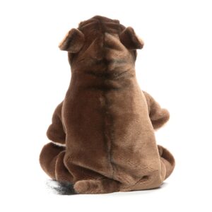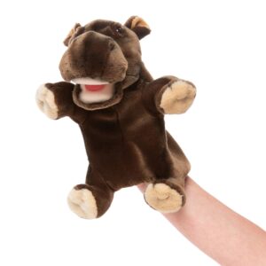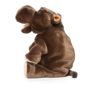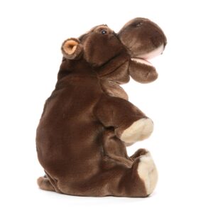 Hippo is a L21.7. cm x W20 cm x H23.7 cm non-jointed, full-bodied plush toy hand puppet. He looks fun yet mischievous with a delightfully tactile touch. All he needs is to be activated. A pocket in his rear allows for a hand to reach in all the way up to his head and front legs to mobilize movement and animate. The hippo himself has a genuine, realistic form and is sewn from a mix of luxurious plush. Primarily dark brown, with a velvety-touch caramel for his finger-twirling inner ears, plus cream for his shaped feet. He has an open-mouthed expression (is he laughing or giggling?), in pale pink with a darker hued, rose pink tongue with fabric detailed nostrils, eye surrounds for his two-tone brown safety eyes and fluffy tail tip. Hand shading has been used to define and shape his distinctive head and torso. You could have great entertainment with this one!