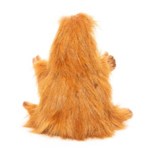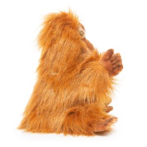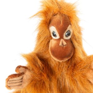 Orangutan is a L8.9 cm x W21.7 cm x H24.7 cm (L8.97"xW8.58"xH9.75") non-jointed, full-bodied plush toy hand puppet. He is awfully cute with his hooded eyes and delightfully tactile touch. All he needs is to be activated. A pocket in his rear allows for a hand to reach in all the way up to his head and front legs to mobilize movement and animate. The orangutan himself has a genuine, realistic form and is sewn from a mix of luxurious plush. Primarily a rich auburn fluffy-pile, with a dense short-pile toffee for his face and hands, plus a warm beige for his palms. Large cream eye patches surround his hooded, two-tone brown safety eyes, above a shaped velvety toffee nose, with delicate hand shading having been applied to his mouth, whilst defining the digits upon his paws. Watch out for the mischief!