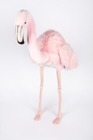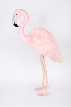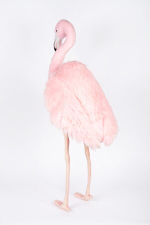 The Flamingo is a L51 cm x W29 cm x H97 cm (20″x11.4″x38.1″), plush soft toy. He has been sewn from a mix of luxurious plush, to resemble that of his living counterpart. This flamingo has a genuine realistic form and has been crafted from a dense, semi-fluffy candy pink short-pile, with an exaggerated candy pink, fluffy long-pile representing long plumage, with velvety-smooth accents for his bill and long, lower limbs. His glossy two-tone pink safety eyes shine out, whilst hand applied painting and shading, has been used to define his distinguished bill and those long, lower limbs. All this and he is still wonderfully soft and cuddly, with a delightfully tactile touch.