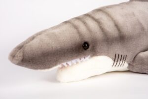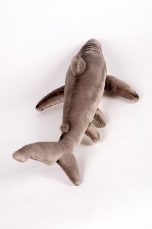The Great White Shark is a L60 cm x W12 cm x H16 cm (23.6"x4.7"x6.2"), plush soft toy. He has been sewn from two luxurious plush, to resemble that of his living counterpart. This great white shark has a genuine realistic form and has been crafted from dense, grey and white short-piles, with individually formed teeth, inside his peachy-pink mouth and embroidered gills on each side. He looks at you, through glossy black safety eyes, whilst hand applied shading, has been used to define and shape, his not-so-fierce face, all his fins and swishy tail, still leaving him wonderfully soft and cuddly, with a delightfully tactile touch.