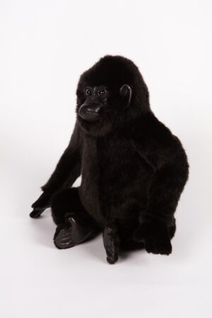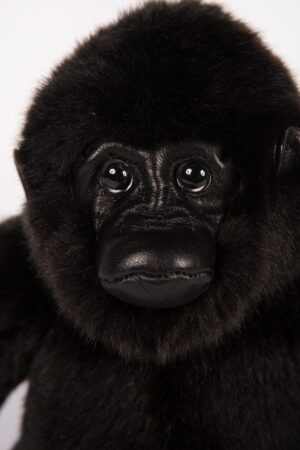 The Gorilla is a L23 cm x W19 cm x H24 cm, (9"x7.4"x7.9.4"), plush soft toy. He has been sewn from a luxurious plush, to resemble that of his living counterpart. This gorilla has a genuine realistic form and has been crafted from a dense semi-fluffy, glossy black mid-pile, with a dense black short-pile for his paws, plus a black faux leather for his ears, face, soles and palms. He has glossy, two-tone brown safety eyes, that shine above his extended muzzle and flat nose, featuring fold, crease and stitch detailing, to obtain the right look, not just for his visage, but his ears and paws too. All of this and he is wonderfully soft and cuddly, with a delightfully tactile touch.