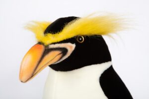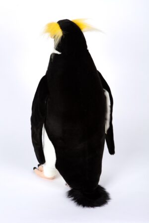 The Snares Penguin is a L31 cm x W22 cm x H54 cm (13.8"x8.6"x21.2"), plush soft toy. He has been sewn from a mix of luxurious plush, to resemble that of his living counterpart. This snares penguin has a genuine realistic form and has been crafted from a dense, velvety-smooth close-pile, in black and white with a fluffy black 'tail', and vibrant yellow crests, plus woven accents for his bill and webbed feet. He has glossy two-tone orange/brown safety eyes, that glimmer out, whilst hand applied painting and shading, has been used to define his fabulous bill and webbed feet. All this and he is still wonderfully soft and cuddly, with a delightfully tactile touch.