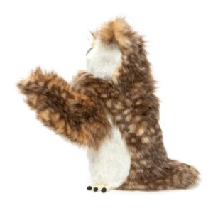 Owl is a L13.9 cm x W28.7 cm x H33.7 cm (L5.5"xW11.3"xH13.3") non-jointed, full-bodied plush toy hand puppet. He is as wise, as he is friendly with a delightfully tactile touch. All he needs is to be activated. A pocket in his rear allows for a hand to reach in all the way up to his head and front legs to mobilize movement and animate. The owl himself has a genuine, realistic form and is sewn from a mix of luxurious plush. Primarily a semi-fluffy, pattern tipped-cocoa on light caramel, that gives the illusion of plumage, along with a dense oatmeal. His curve ended beak and claw ended talons are both velvety smooth, whilst his glossy two-tone golden eyes, are surrounded in white. Delicate hand applied shading has been applied to define and shape said beak and feet, with his inner wings and tummy receiving the same treatment. Be mindful of those sharp talons!