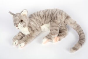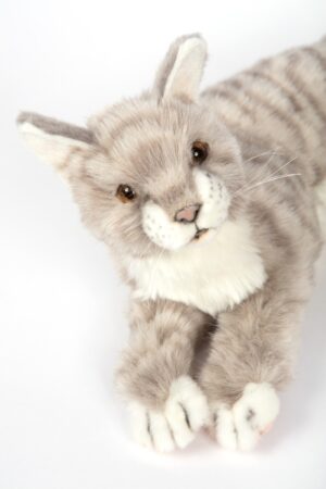 The Blue Tabby Cat is a L37 cm x W24 cm x H19 cm (14.5"x9.4"x7.4"), plush soft toy. She has been sewn from a mix of luxurious plush, to resemble the coat of her living counterpart. The blue tabby cat herself has a genuine realistic form and has been crafted from a dense, grey, with darker hued stripes and white for her under carriage, muzzle and paws, plus velvety-smooth auburn and white accents, for her ears, with peachy-pink for her shaped paw pads. Her endearing feline safety eyes, are a two-tone orange, shining out above her moulded feline nose, acrylic whiskers and hand stitched features. Carefully applied hand painting has been activated to define, shape and create, including her bottom lip, enhancing her ears, the claws on her paws and of course her enchanting visage. All this and she is still wonderfully soft and cuddly, with a delightfully tactile touch.