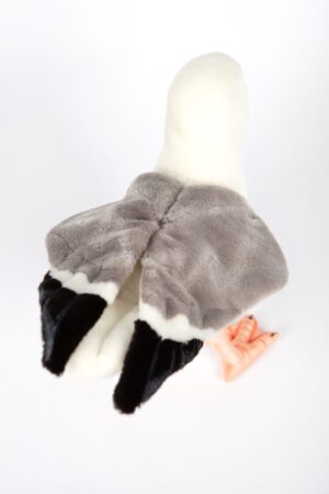 He is made using wonderful soft white and grey plush with black plush wing tips. Fine airbrushed details have been added by hand for definition and shading on his velvety smooth legs and beak. He has an internal support system so he can stand unaided.