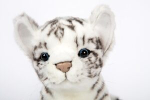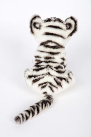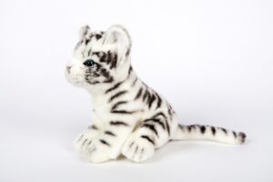 The White Tiger Cub is a L17 cm x W11 cm x H15 cm, (6.6"x4.3"x5.9"), plush soft toy. He has been sewn from a luxurious plush, to resemble that of his living counterpart. The white tiger cub has a genuine realistic form and has been crafted from a dense white short-pile, with smooth white inner ears. His glossy, two-tone blue safety eyes, glimmer above his moulded feline nose and acrylic whiskers, whilst carefully applied hand painting, has been meticulously activated in recreating his fabulous striped coat and stunning facial features, for that true-to-life appeal. All of this and he is wonderfully soft and cuddly, with a delightfully tactile touch.