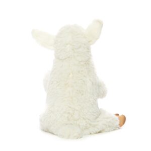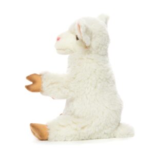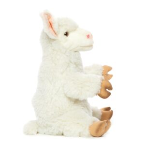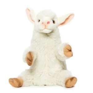 Lamb is a L22.7 cm x W19.8 cm x H27.7 cm (L8.97"xW7.8"xH10.92") non-jointed, full-bodied plush toy hand puppet. He has a cheeky character, with a delightfully tactile touch. All he needs is to be activated. A pocket in his rear allows for a hand to reach in all the way up to his head and front legs to mobilize movement and animate. The lamb himself has a genuine, realistic form and is sewn from a luxurious plush. A dense and warm, fleecy textured white plush, with dense white accents, plus velvety-touch pink inner ears and brown shaped hooves. He has finger-twirling ears and a floppy tail, plus glossy two-tone brown, slit-pupil eyes, that sit upon a beige underlay. Delicate hand applied shading has been applied to create shape and define his nostril and mouth, plus those magnificent hooves. Baa Baa!