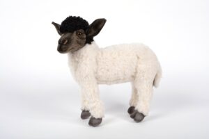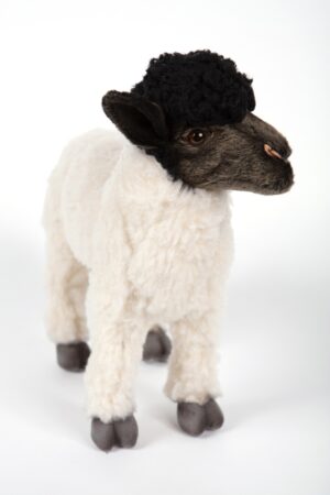 The Suffolk Sheep is a L30 cm x W11 cm x H30 cm (11.8″x4.3″x11.8″), plush soft toy. He has been sewn from a mix of luxurious plush, to resemble the coat of his living counterpart. The Suffolk sheep himself has a genuine, realistic form and has been crafted from a dense and tufty textured off-white fleece, with black fleece accents for his head, alongside a dense, white-tipped black, close-pile for his face and ears, plus velvety-smooth additions for his hooves, whilst large, hooded, glossy two-tone safety eyes, with a hand stitched nose and mouth create his face. Hand applied shading and painting brings shape and definition, not only to his sweet features, but his ears and hooves too. All this and he is wonderfully soft and cuddly, with a delightfully tactile touch.